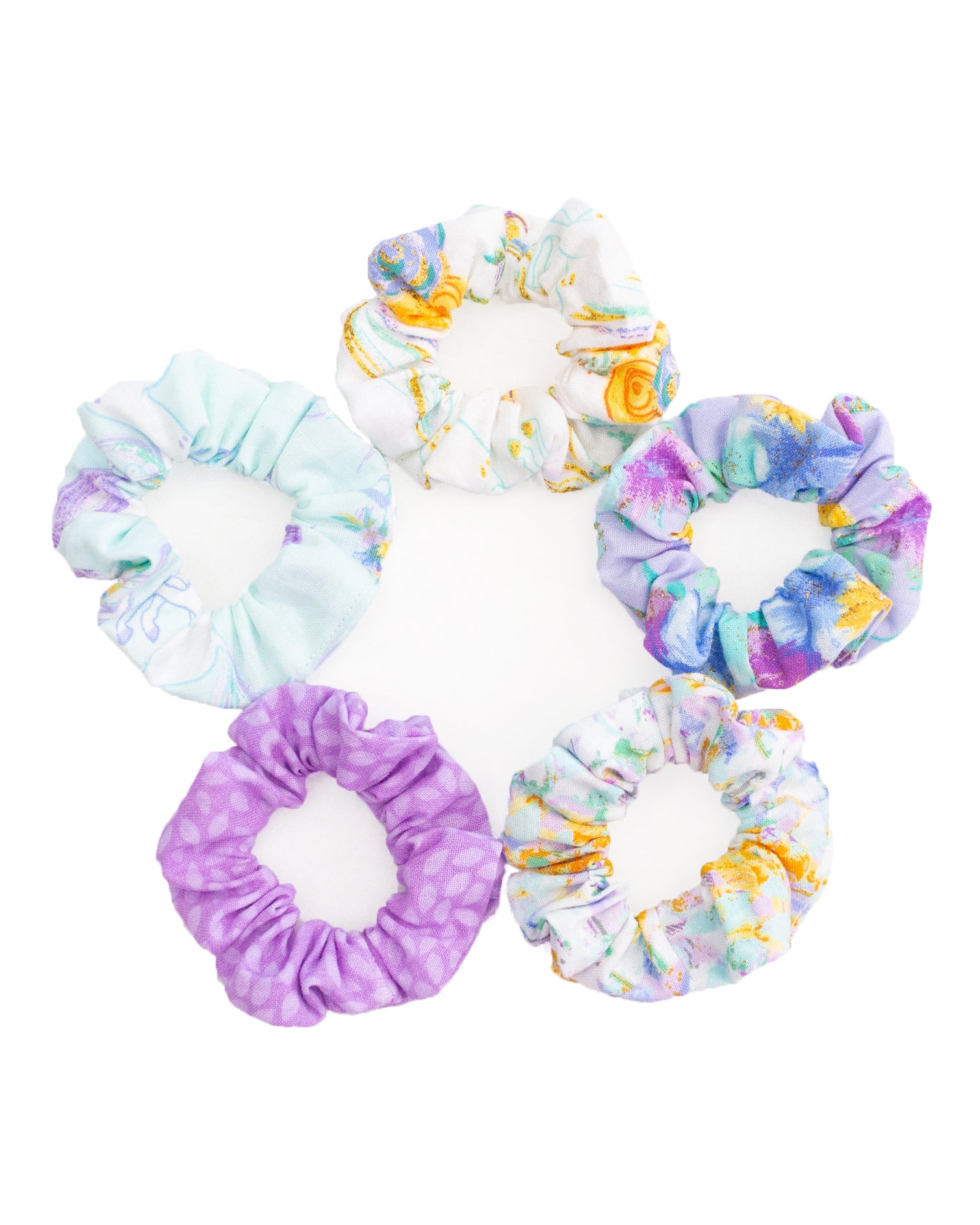 A set of 5 XS scrunchies. Made with a thin elastic to secure your hair in place. These XS scrunchies are perfect for toddlers or teens. Depending on hair type, you can tie the scrunchie around your hair 2-3 times.